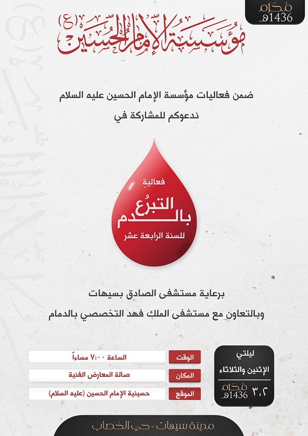 ضمن فعاليات مؤسسة الإمام الحسين عليه السلام ندعوكم للمشاركة في فعالية التبرع بالدم للسنة الرابعة عشر .