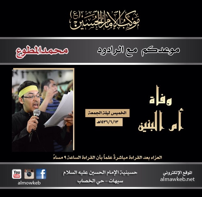 يشارك الرادود الحسيني محمد المطوع في ذكرى وفاة السيدة أم البنين (ع) يوم الخميس ليلة الجمعة. سيبدأ العزاء بعد القراءة والتي ستبدأ في تمام التاسعة مساءً بإذن الله -تعالى- في حسينية الإمام الحسين (ع) بحي الخصاب بسيهات.