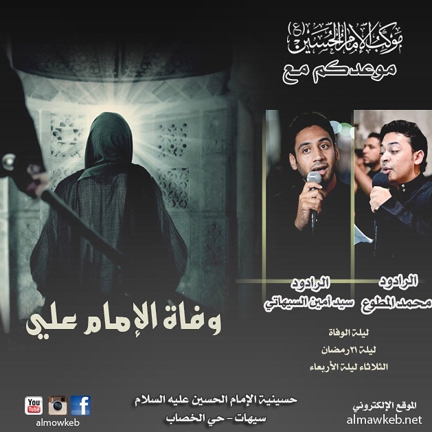 يدعوكم موكب الإمام الحسين (ع) بسيهات للمشاركة في الليلة الثالثة لذكرى استشهاد أمير المؤمنين الإمام علي بن أبي طالب (ع) يوم الثلاثاء ليلة الأربعاء بمشاركة الرادودين محمد المطوع والسيد أمين السيهاتي.
