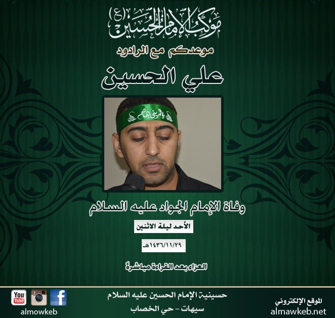يدعوكم موكب الإمام الحسين (ع) بسيهات للمشاركة في ذكرى استشهاد الإمام الجواد (ع) يوم الأحد ليلة الاثنين بمشاركة الرادود علي الحسين. سيبدأ العزاء بعد القراءة مباشرة في حسينية الإمام الحسين (ع) بحي الخصاب بسيهات.