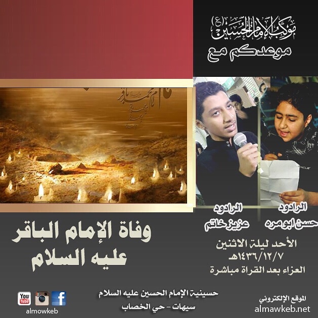 يدعوكم موكب الإمام الحسين (ع) بسيهات للمشاركة في ذكرى استشهاد الإمام محمد بن علي الباقر (ع) يوم الأحد ليلة الاثنين. يُشارك الرادودان حسن أبو مرة وعزيز خاتم في العزاء بعد القراءة مباشرةً في حسينية الإمام الحسين (ع) بحي الخصاب بسيهات.