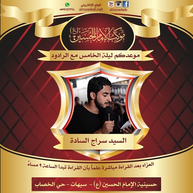 موعدكم ليلة الخامس من المحرم مع الرادود السيد سراج بعد القراءة مباشرة والتي تبدأ في التاسعة مساءً بإذن الله -تعالى-.