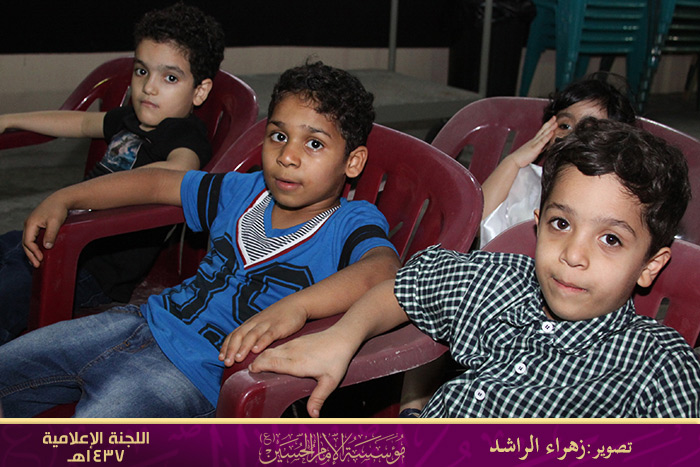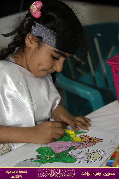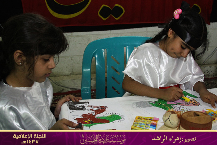 وفعّلت اللجنة في الليلة الأولى ركن الرسم للأطفال، ليوضحوا مشاعرهم و أفكارهم حول معركة كربلاء وآل الحسين عليهم السلام من خلال الفن.