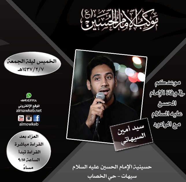يدعوكم موكب الإمام الحسين (ع) للمشاركة في ذكرى استشهاد سبط رسول الله (ص) الإمام الحسن المجتبى (ع) مع الرادود الحسيني السيد أمين السيهاتي. سيبدأ العزاء بعد القراءة مباشرة، والتي تبدأ في تمام التاسعة والربع يوم الخميس ليلة الجمعة في حسينية الإمام الحسين (ع) بحي الخصاب بسيهات.
