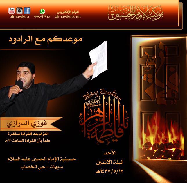 يدعوكم موكب الإمام الحسين (ع) بسيهات للمشاركة في ذكرى استشهاد سيدة نساء العالمين فاطمة الزهراء (ع) يوم الأحد ليلة الاثنين. يُشارك في العزاء الرادود الحسيني فوزي الدرازي. سيبدأ العزاء بعد القراءة مباشرةً والتي ستبدأ في تمام الثامنة والنصف مساءً في حسينية الإمام الحسين (ع) بحي الخصاب بسيهات.