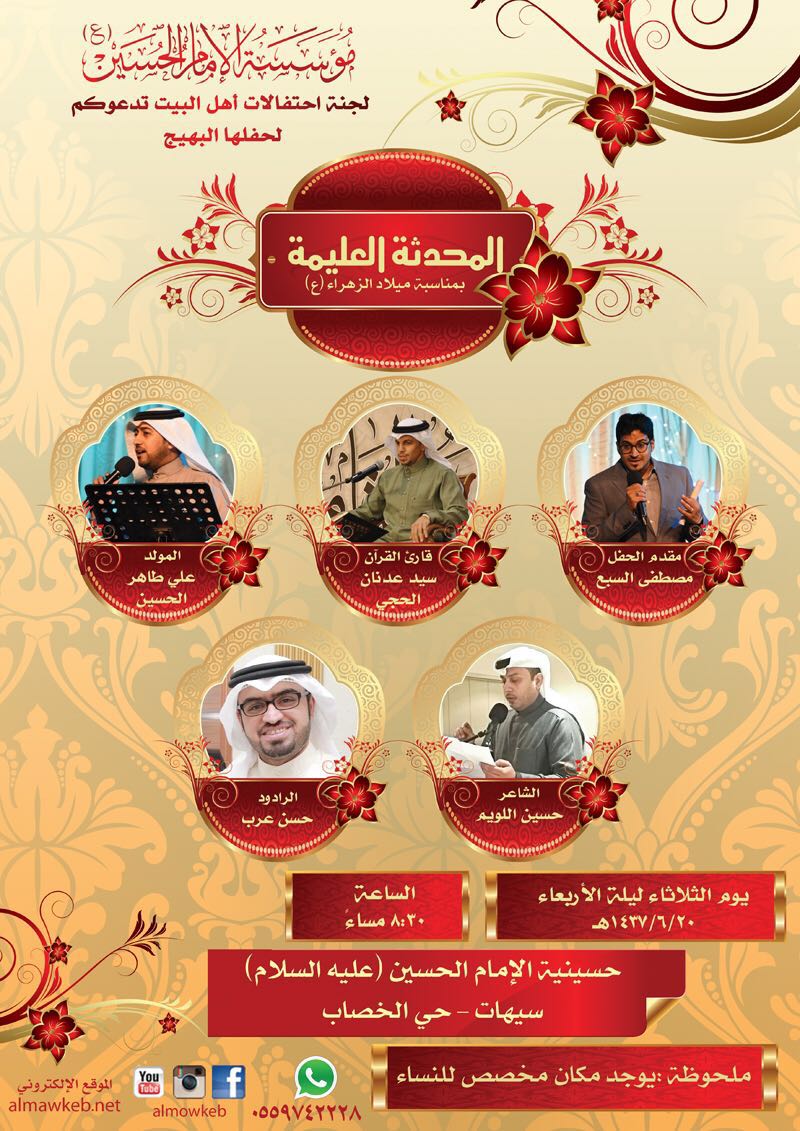 تدعوكما مؤسسة الإمام الحسين (ع) ولجنة احتفالات أهل البيت (ع) لحضور الحفل البهيج ( المحدثة العليمة ) المُقام بمناسبة ميلاد سيدتنا فاطمة الزهراء (ع) يوم الثلاثاء ليلة الأربعاء. سيُقام الحفل في حسينية الإمام الحسين (ع) بحي الخصاب بسيهات ابتداءً من الساعة الثامنة والنصف مساءً، كما سيوجد مكان مخصص للنساء.