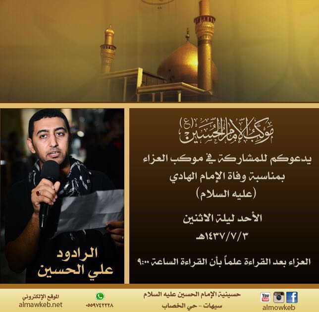 يدعو موكب الإمام الحسين (ع) الجمهور الحسيني للمشاركة في ذكرى استشهاد الإمام علي الهادي (ع) يوم الأحد ليلة الاثنين مع الرادود علي الحسين. سيبدأ العزاء بعد القراءة مباشرةً في حسينية الإمام الحسين (ع) بحي الخصاب بسيهات، والتي ستبدأ في تمام التاسعة مساءً بإذن الله -تعالى-.