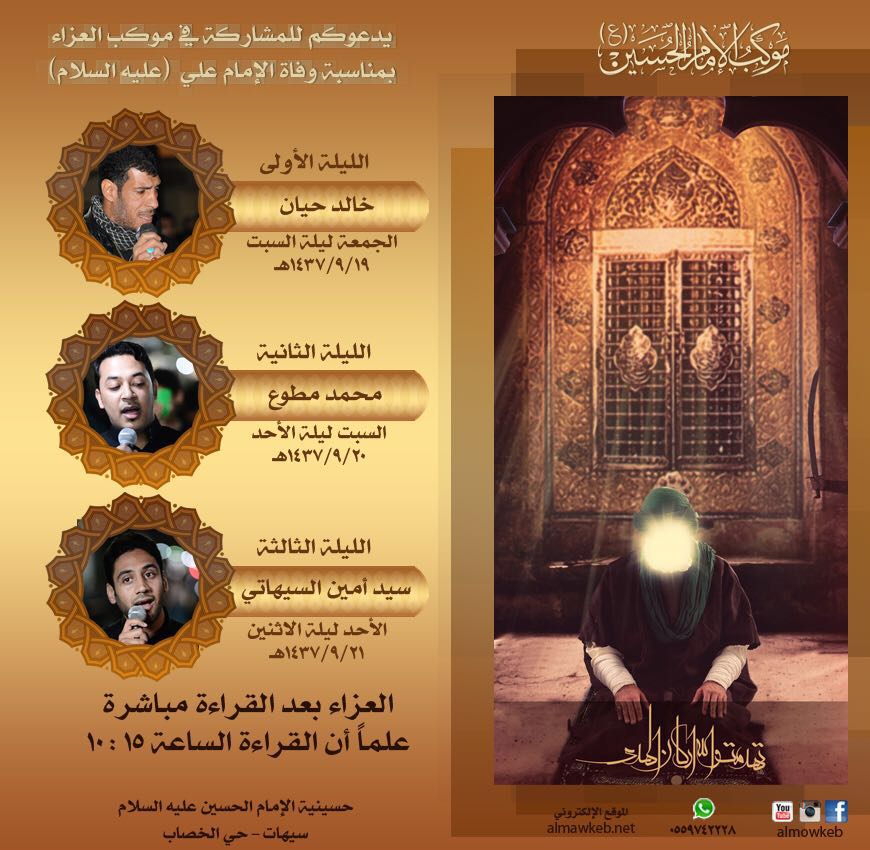 يدعوكم موكب الإمام الحسين (ع) للمشاركة في العزاء المُقام بمناسبة ذكرى استشهاد أمير المؤمنين الإمام علي بن أبي طالب (ع) ابتداءً من يوم الجمعة ليلة السبت. يُشارك في ليلة الضربة الرادود الحسيني خالد حيان ثم يليه الرادود الحسيني محمد المطوع في ليلة الوصية وأخيراً الرادود سيد أمين السيهاتي في ليلة الوفاة.