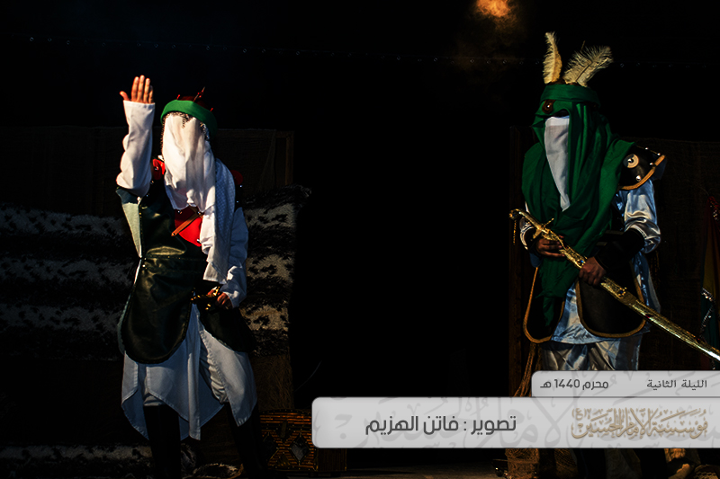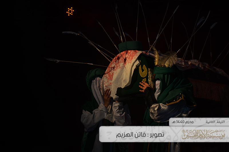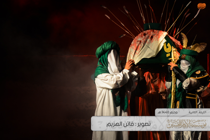 بدأ العرض بحمل جنازة الإمام الحسن عليه السلام والسهام ترمى عليها من قبل جنود ذلك العصر، ومستهترات العصر الحالي.