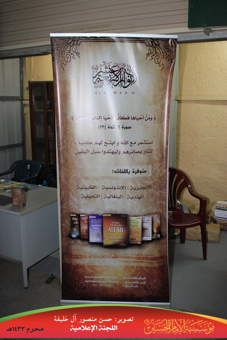 مؤسسة الأنوار الأربعة عشر عليهم السلام الثقافية كان لها ركنها الخاص في ساحة مؤسسة الإمام الحسين (ع) والتي تهدف إلى نشر فكر وثقافة أهل البيت عليهم السلام عن طريق الكتب، الأقراص المدمجة، وأشرطة الكاسيت وتدعو للمساهمة عن طريق التبرع بشراء إصداراتهم و التي سيقومون بتوزيعها إلى جميع دول العالم وبلغات مختلفة (الإنجليزية، الأندونسية، الهندية، البنغالية، التاملية) وتلك هي التجارة الرابحة مع الله سبحانه وتعالى عن طريق شراء الكتب لهم لتُنَار بصائرهم وليهتدوا إلى سبل اليقين.