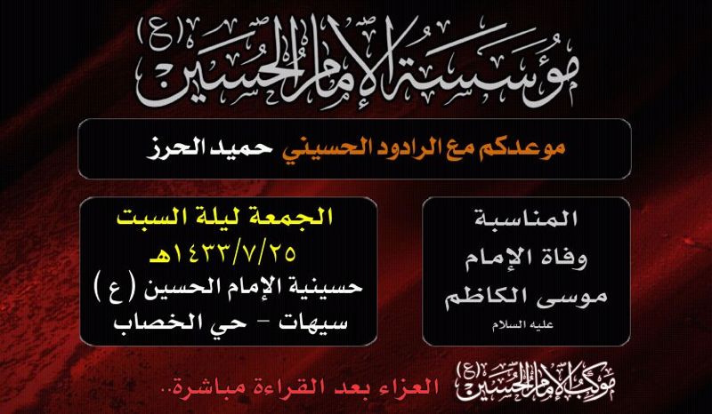 تدعوكم مؤسسة الإمام الحسين (ع) للمشاركة في ذكرى استشهاد الإمام موسى الكاظم (ع) ليلة السبت. ستكون القراءة في تمام الساعة التاسعة والنصف مساءً -بإذن الله- ويليها العزاء الحسيني بمشاركة الرادود حميد الحرز.
