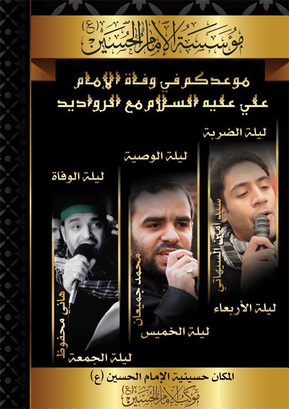 تدعوكم مؤسسة الإمام الحسين (ع) للمشاركة في ذكرى استشهاد الإمام أمير المؤمنين علي بن أبي طالب (ع) ليالي الأربعاء والخميس والجمعة. سيكون العزاء بمشاركة الرادود سيد أمين السيهاتي ليلة الضربة (ليلة الأربعاء)، والرادود محمد جميعان ليلة الوصية (ليلة الخميس)، والرادود هاني محفوظ ليلة الوفاة (ليلة الجمعة).