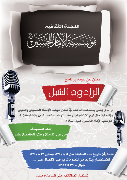 تعلن اللجنة الثقافية بمؤسسة الإمام الحسين (ع) عن عودة برنامج "الرادود الشبل" لفعاليات شهر محرم الحرام۔ البرنامج يعنى بصقل موهبة الإنشاد الحسيني لدى الناشئة وإتاحة الفرصة لهم للانضمام لركب الرواديد الحسينين۔