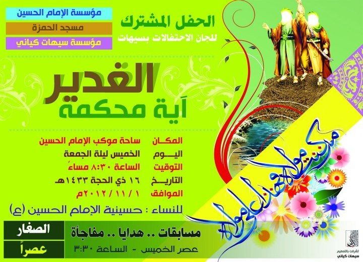 تدعوكم مؤسسة الإمام الحسين (ع) للمشاركة في الاحتفال المشترك بذكرى عيد الغدير الأغر يوم الخميس ليلة الجمعة في تمام الساعة الثامنة والنصف مساءً، بإذنه تعالى في ساحة موكب الإمام الحسين (ع).