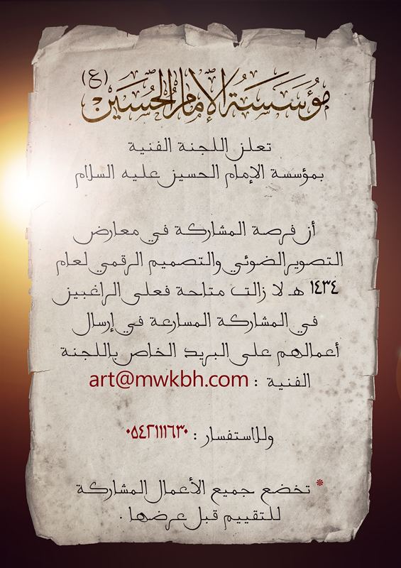 تعلن اللجنة الفنية بمؤسسة الإمام الحسين (ع) أن فرصة المشاركة في معارض التصوير الضوئي والتصميم الرقمي لعام 1434هـ لا زالت متاحة فعلى الراغبين في المشاركة المسارعة في إرسال أعمالهم على البريد الموضح في الصورة ادناه .
