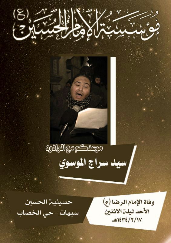 تدعوكم مؤسسة الإمام الحسين (ع) للمشاركة في ذكرى استشهاد الإمام علي بن موسى الرضا (ع) بمشاركة الرادود السيد سراج الموسوي ليلة الاثنين.