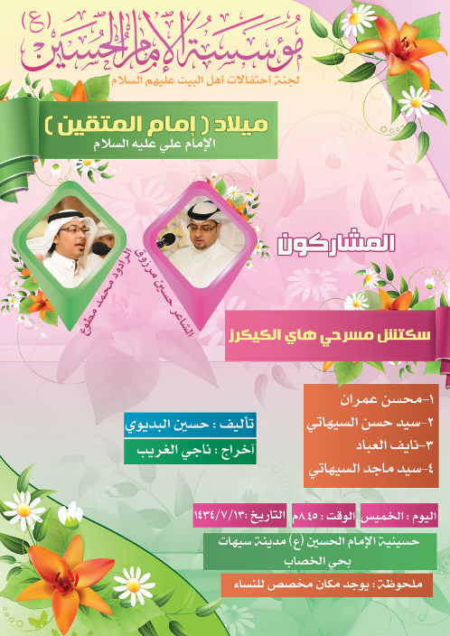 تدعوكم مؤسسة الإمام الحسين (ع) للمشاركة في حفلها البهيج بمناسبة ميلاد سيد الوصيين الإمام علي بن أبي طالب (ع) وذلك يوم الخميس ليلة الجمعة ابتداءً من الساعة 8:45 مساءً، بإذن الله -تعالى-.