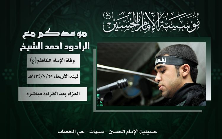تدعوكم مؤسسة الإمام الحسين (ع) للمشاركة في ذكرى استشهاد الإمام موسى الكاظم (ع) يوم الثلاثاء ليلة الأربعاء بمشاركة الرادود أحمد الشيخ.