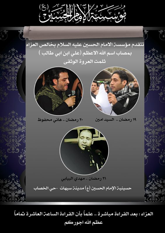 تدعوكم مؤسسة الإمام الحسين (ع) للمشاركة في ليالي استشهاد الإمام علي بن أبي طالب (ع). يشارك في العزاء كلٌ من: الرادود السيد أمين السيهاتي ليلة التاسع عشر، والرادود هاني محفوظ ليلة العشرين، والرادود مهدي البيابي ليلة الحادي والعشرين. ستكون القراءة في تمام الساعة العاشرة مساءً ويليها العزاء، بإذنه تعالى.