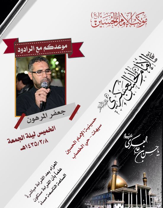 تدعوكم مؤسسة الإمام الحسين (ع) للمشاركة في ذكرى استشهاد الإمام الحسن العسكري (ع) بمشاركة الرادود جعفر المرهون وذلك يوم الخميس ليلة الجمعة. سيكون العزاء بعد القراءة مباشرة والتي ستبدأ في تمام التاسعة -بإذن الله تعالى- في حسينية الإمام الحسين (ع) بحي الخصاب بسيهات.