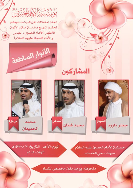 تدعوكم لجنة احتفالات أهل البيت (ع) ومؤسسة الإمام الحسين (ع) لحضور الحفل البهيج ( الأنوار الساطعة ) بمناسبة ميلاد الإمام الحسين والعباس والإمام السجاد عليهم السلام۔ وذلك يوم الأحد ليلة الاثنين في حسينية الإمام الحسين (ع) بحي الخصاب بسيهات۔