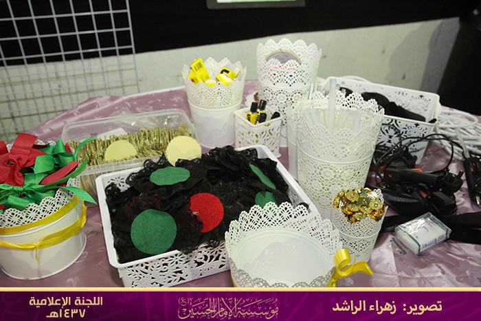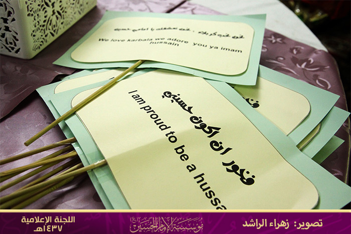 وتضمن البرنامج ورش عمل، منها فنية اشتملت على تنفيذ بروشات طبع عليها لفظ ياحسين، وطباعة الخيل على الورق الملون، بالإضافة لتنفيذ أعلام حسينية تم تلوينها، وشعار حمل عبارة " فخور أن أكون حسينياً، إلى جانب عمل فني يرمز للإمام الحسين عليه السلام بخامة الجوخ، للاستفادة منه كغلاف للجوال أو الأيباد، بهدف ربط الطفل بالإمام الحسين حتى في أبسط الأشياء.