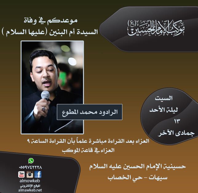 موعدكم في ذكرى وفاة السيدة أم البنين (ع) مع الرادود محمد المطوع