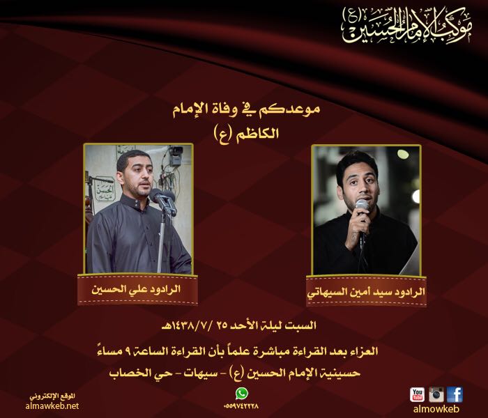 موعدكم في ذكرى استشهاد الإمام الكاظم (ع) مع الرادودين السيد أمين السيهاتي وعلي الحسين