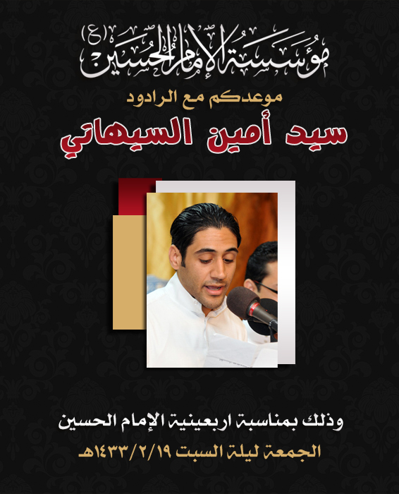 تدعوكم المؤسسة للمشاركة في إحياء ذكرى أربعين الإمام الحسين (ع) ليلة السبت حيث يرتقي المنبر الخطيب ملا مهند الحواج في تمام الساعة التاسعة بإذن الله، ثم تلي المحاضرة شعيرة العزاء الحسيني بمشاركة الرادود سيد أمين السيهاتي.