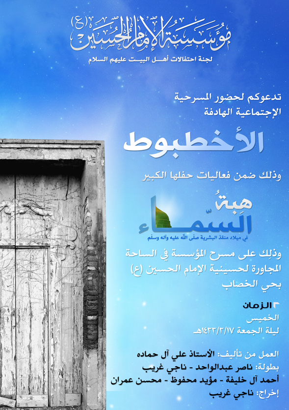 تعلن مؤسسة الإمام الحسين عليه السلام ضمن فقرات المولد الشريف - هبة السماء .. المسرحية الهادفة ( الأخطبوط ) . والتي سوف تقام على مسرح مؤسسة الإمام الحسين (ع) . وذلك يوم الخميس ليلة الجمعة الموافق 17/3/1433هـ .