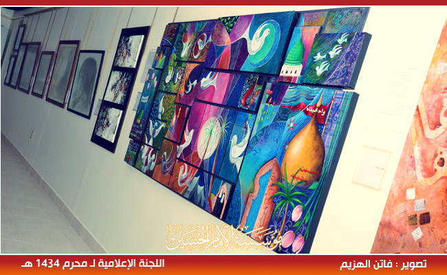 وأوضحت أن الإعلان عن استقبال المشاركات منذ العام الماضي، كما تم اختيار ثمان أشخاص مميزين لهم خبرة في الفن التشكيلي لتكون أعمالهم محور المعرض، مضيفةً بأن عمل سرب الكرامة للفنانة رقية التاروتي تحدث عن شهداء القطيف، بينما تكلم عمل الفنانة مهدية آل طالب عن الخيول، بينما تكلم عمل الفنانة عواطف صفوان عن السجود، وكان مضمون عمل الفنانة فاطمة الزاهر حوار بين المحسن والرضيع.