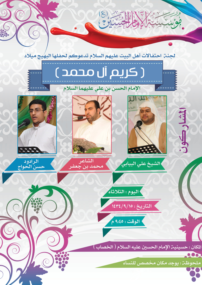 تدعوكم مؤسسة الإمام الحسين (ع) ولجنة احتفالات أهل البيت (ع) للمشاركة في ذكرى ميلاد الإمام الحسن بن علي (ع) يوم الثلاثاء ليلة الأربعاء ابتداءً من الساعة ٩:٤٥م. يشارك في الحفل كلٌ من: الشيخ علي البيابي، والشاعر محمد بن جعفر، والرادود حسن الحواج.